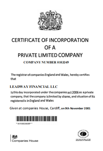 LEADWAY FINANCE LLC is certified by the Registrar of Companies for England and Wales, at the Companies House, Cardiff on 9th November 2001. The maximum efficiency of commercial activity involves making a profit and minimizing overhead costs by all legal methods. In particular, Leadwayfinancellc.net has placed the business as a resident in United Kingdom, where the government has provided high preferences for our business, also in the matter of optimizing tax payments from profits.