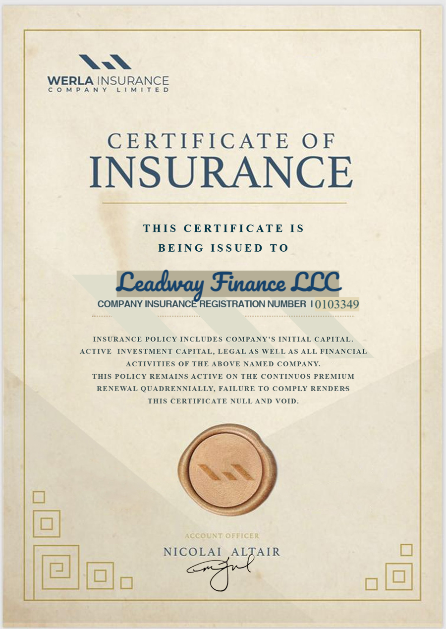 LEADWAY FINANCE LLC have an Insurance Certificate, which makes it legal as well as financially active. By diversifying trading business lines and lowering overhead costs, Leadwayfinancellc.net can further increase competitive pressure in the investment market by consolidating online investment ideas with an ever-increasing number of investors and customers on completely legal grounds. View Certificate